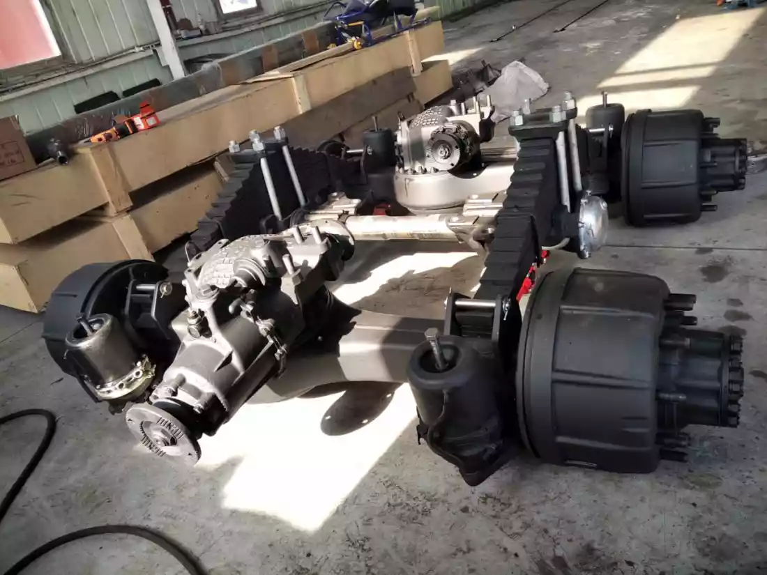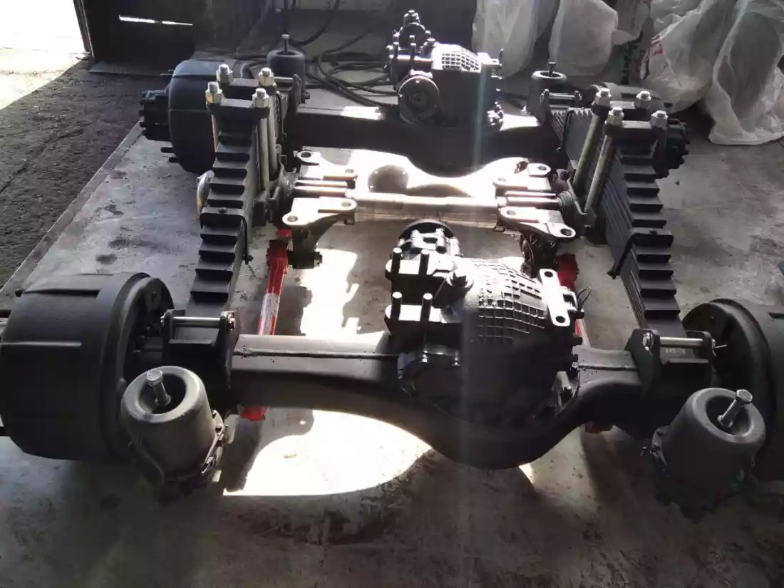 Редуктор средний, редуктор задний, МОТ, ось балансира, башмак, реактивная штанга, ступица, тормозной барабан, рессоры, энергоаккумуляторы, межосевой кардан |